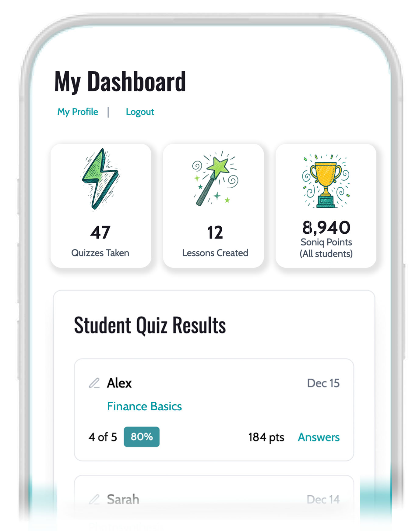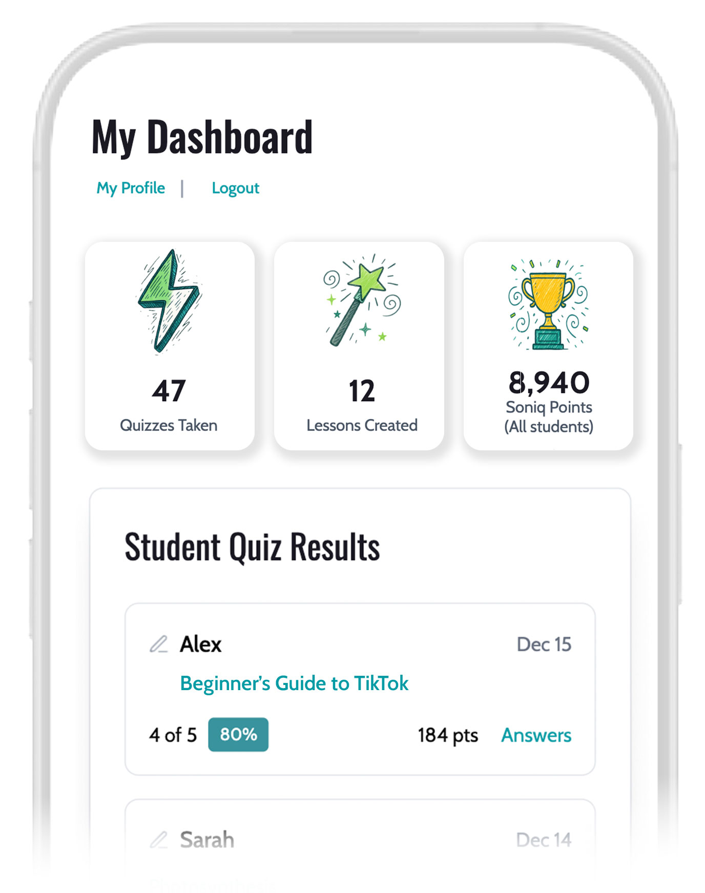Clear dashboard for videos, quizzes, and leaderboards.
